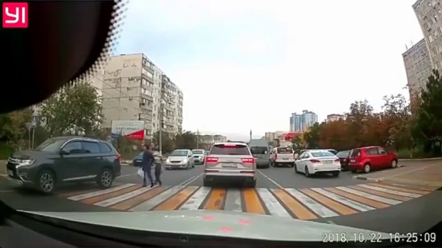 При переходе по пешеходному переходу, ребёнок побежал впереди своей мамы и едва не угодил под колеса внедорожника. #пешеход #дети #внезапно #повезло