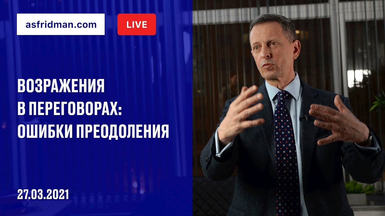 Возражения в переговорах: ошибки преодоления. Прямой эфир от 27.03.2021. *** Александр Фридман — консультант и бизнес-тренер, эксперт по регулярному менеджменту и профессиональной эксплуатации персонала. Официальный сайт Александра Фридмана: https://www.asfridman.com/ Расписание: https://www.asfridman.com/raspisanie/ Telegram: https://t.me/asfridman VK: https://new.vk.com/fridman.management LinkedIn: https://www.linkedin.com/in/asfridman/ Книги Александра Фридмана: https://www.ozon.ru/person/fridman-aleksandr-semenovich-4044011/category/knigi-16500/ https://www.litres.ru/aleksandr-fridman/ https://www.wildberries.ru/catalog/0/search.aspx?search=александр+фридман&targeturl=ST Кадровый консалтинг от Александра Фридмана: https://fridmanfridman.ru/