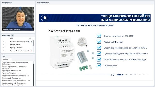 Вебинар “Профессиональные блоки питания SKAT-STELBERRY” Источник питания SKAT-STELBERRY 12/0,2 DIN предназначен для электропитания слаботочной электроники, чувствительной к качеству питающего напряжения. Благодаря низкому уровню пульсации выходного напряжения отлично подходит для совместной работы с микрофонами и другим аудиооборудованием. Особенности: - преобразование переменного напряжения в постоянное номиналом 12 В; - защита от перенапряжения и импульсных помех на входе; - подключение одного или двух микрофонов; - защита от короткого замыкания с последующим самовосстановлением. Программа вебинара 1. Краткая презентация компании "БАСТИОН" 2. Проблемы использования импульсных блоков питания с профессиональными микрофонами Stelberry 3. Технические характеристики блока питания SKAT-STELBERRY 4. Сравнение качества аудио-сигнала микрофона Stelberry, запитанного от импульсного и трансформаторного блоков питания Лектор - руководитель учебного центра Головань Алексей Игоревич Вебинар состоялся при поддержке ООО "ТД ТИНКО" 24.11.2020 Источник питания SKAT-STELBERRY 12/0,2 DIN в Каталоге ТСБ "ТД ТИНКО" https://www.tinko.ru/catalog/product/288691/