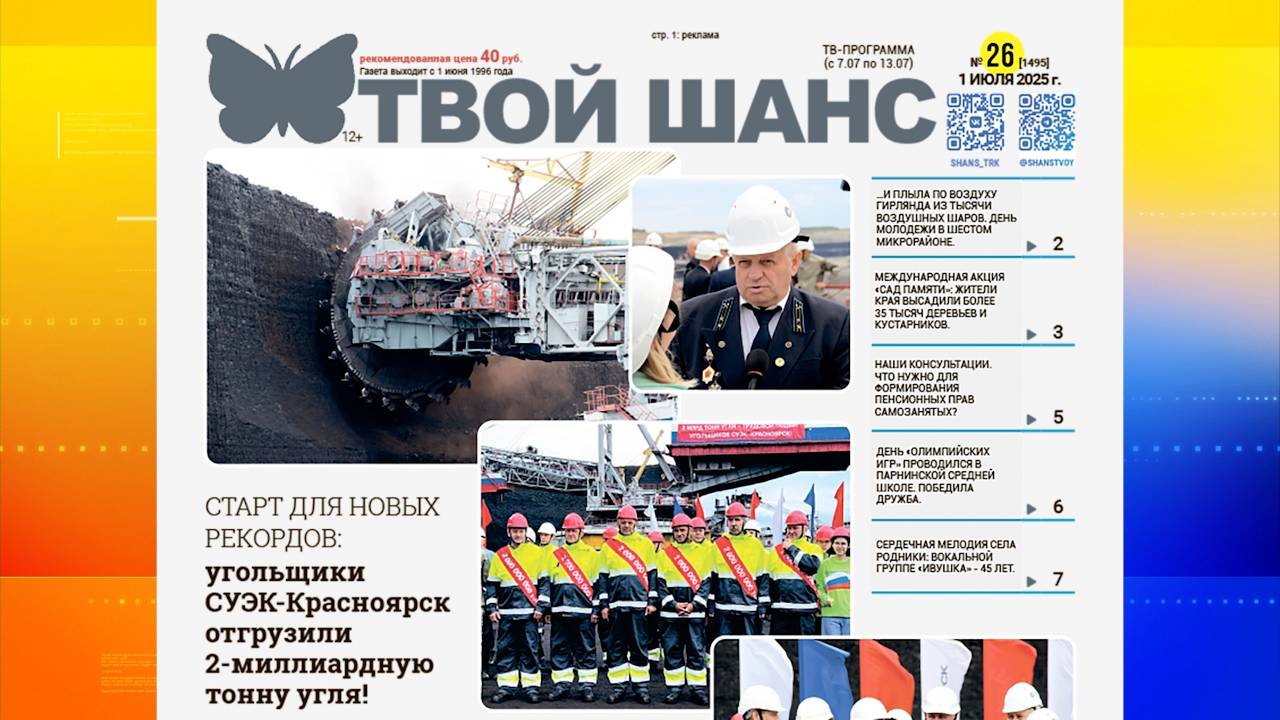 Собрали для вас важные краевые новости на странице 3. Информацию по пенсионному страхованию самозанятых читайте на странице 5. Ретрофест в Парной, восстановление часовни и другие новости округа на странице 7. Рецепты вкусных завтраков на странице 8. Значимый рекорд угольщиков – читайте на странице 21. Как всегда, свежие вакансии, объявления недвижимости, сканворд, гороскоп и конечно телепрограмма – всё это вы найдете в еженедельнике «Твой Шанс»!