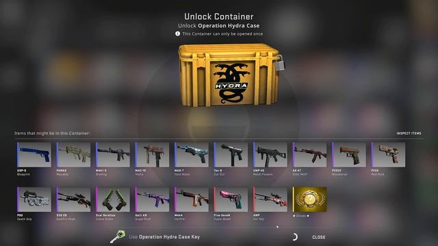 The Operation Hydra Case is a weapon case of community created weapon skins and new gloves released in the May 23, 2017 update, alongside with Operation Hydra as an exclusive drop to pass holders. It requires a Operation Hydra Case Key to be opened.