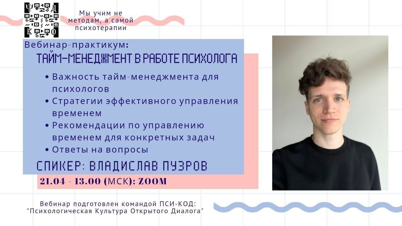 ВЕБИНАР-ПРАКТИКУМ "ТАЙМ-МЕНЕДЖМЕНТ В РАБОТЕ ПСИХОЛОГА" ⁉️Что узнаем на вебинаре? • Что такое тайм-менеджмент и зачем он нужен психологу? • Разберем стратегии управления временем в организации психологической практики • Обсудим рекомендации для решения конкретных задач в работе психолога • Ответим на ваши вопросы Ведущий: ПУЗРОВ Владислав - когнитивно-поведенческий специалист - дипломированный специалист по психотерапии зависимого поведения