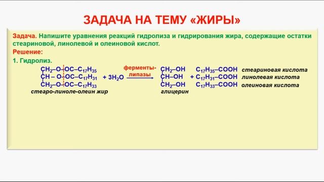 Уроки по химии. Органическая химия. Подготовка к ЕГЭ. № 113. Органическая химия. Тема 20. Жиры. Часть 1. Общее понятие о жирах. - http://youtu.be/7CBOPKQFwsA № 114. Органическая химия. Тема 20. Жиры. Часть 2. Состав жиров. - http://youtu.be/xEul3rEFelA № 115. Органическая химия. Тема 20. Жиры. Часть 3. Номенклатура и классификация жиров. - http://youtu.be/ePZEepOG4Bc № 116. Органическая химия. Тема 20. Жиры. Часть 4. Физические свойства жиров. - http://youtu.be/Xs-N_fzqPTc № 117. Органическая химия. Тема 20. Жиры. Часть 5. Химические свойства жиров. - http://youtu.be/5Q3lI1j8cDM № 118. Органическая химия. Тема 20. Жиры. Часть 6. Виды порчи жиров. - http://youtu.be/4Jzn1DmzulI № 119. Органическая химия. Тема 20. Жиры. Часть 7. Мыла и моющие средства. Получение мыла. - http://youtu.be/UUWF5RwC-aU № 120. Органическая химия. Тема 20. Жиры. Часть 8. Моющее действие мыла. Применение мыла. - http://youtu.be/GMuzOYv55kA № 121. Органическая химия. Тема 20. Жиры. Часть 9. Физико-химические константы жиров. - http://youtu.be/se7nlW56MVs № 122. Органическая химия. Тема 20. Жиры. Часть 10. Задача на тему «Жиры». -- http://youtu.be/lKjHGFyum4s № 123. Органическая химия. Тема 20. Жиры. Часть 11. Задача на тему «Жиры». - http://youtu.be/GRYQ1JC_KU4 № 124. Органическая химия. Тема 20. Жиры. Часть 12. Жироподобные вещества. Фосфолипиды, лецитин. - http://youtu.be/ftLJbUhlYag № 125. Органическая химия. Тема 20. Жиры. Часть 13. Жироподобные вещества. Фосфатиды. - http://youtu.be/MgB0lJxPWiE № 126. Органическая химия. Тема 20. Жиры. Часть 14. Жироподобные вещества. Стерины. Воски. - http://youtu.be/YIjmD7bjGoc