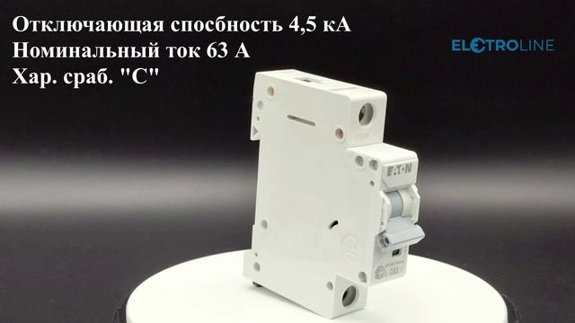 Модульный автоматический выключатель производства Eaton. Однополюсный, с кривой отключения "C". Номинальный ток 63 А. Применяется в жилых помещениях, частных домах и там, где достаточно отключающей способности 4,5 кА. Монтаж на Din-рейку. Подробнее, смотрите на страничке нашего интернет-магазина, по ссылке: https://electroline.ru/product/hl-c631-modulnyy-avtomaticheskiy-vyklyuchatel-1-polyus-krivaya-otklyucheniya-c-nominalnyy-tok-63a.html