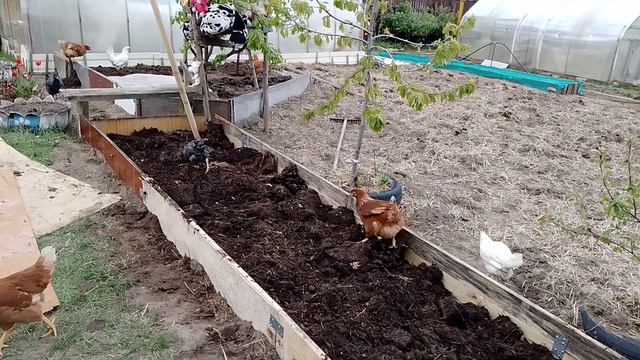 Куры несушки на новой грядке с перегноем