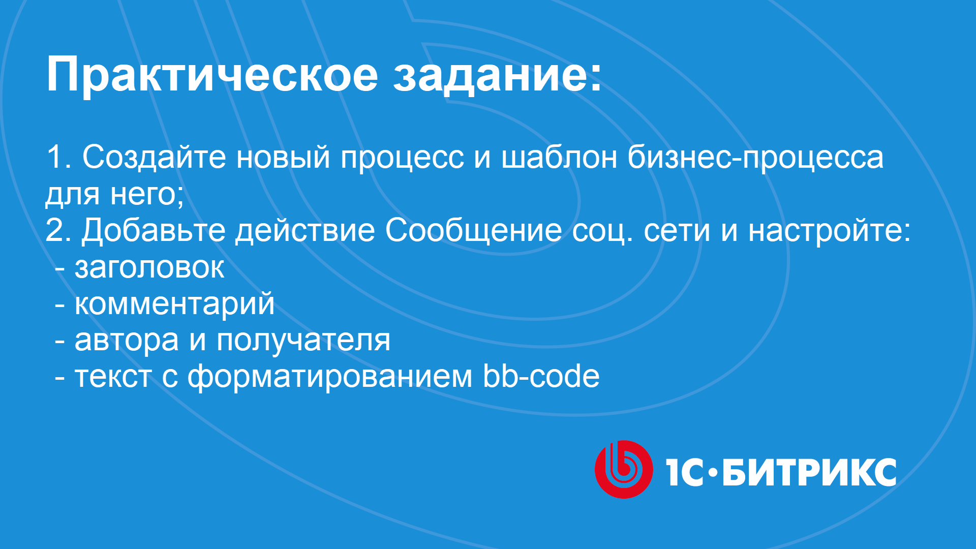 ** видео без голосового сопровождения К уроку Практические задания в главе Действия курса Бизнес-процессы: https://dev.1c-bitrix.ru/~pfW3N Задание № 1: Создайте новый процесс с названием Уведомления в Процессах ленты новостей. Добавьте для процесса новый шаблон последовательного бизнес-процесса и действие Сообщение соц. сети. В действии заполните параметры следующим образом: Замените заголовок на свой вариант; Добавьте комментарий; В качестве отправителя укажите Автора, а получателем - группу Администраторы. Добавьте группу через раздел "Категории пользователей" в форме Вставка значения; Напишите текст и отформатируйте его при помощи bb-code, чтобы получился такой результат (см. в уроке https://dev.1c-bitrix.ru/~pfW3N)