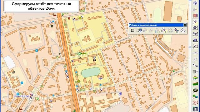 В уроке рассмотрены операции по анализу данных векторной карты: просмотр значение семантики в точке карты, сохранение списка объектов в отчет, выделение объектов по названию.