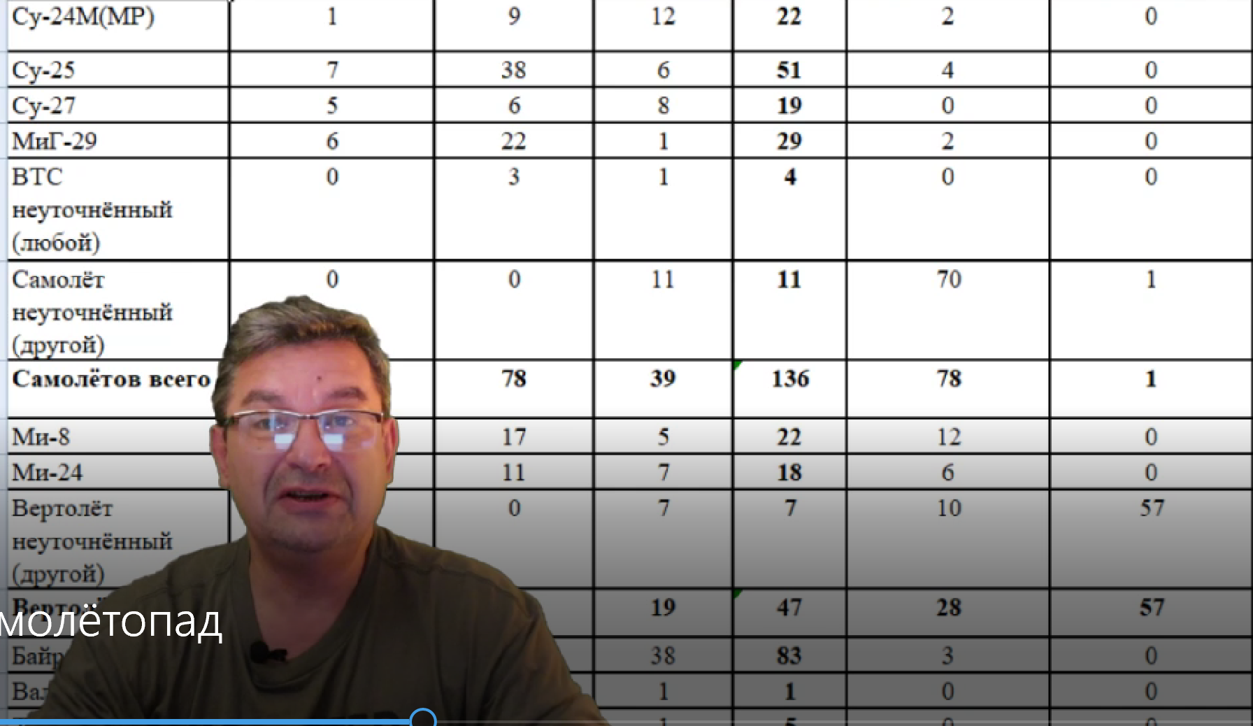 Сбербанк: 5469 4000 3923 0292 и Телега: https://t.me/Mikle1On/ На 11-00 28 июня уничтожены: 218 самолетов, 133 вертолета. Из сводки на 14-00 27 июня: Всего с начала проведения специальной военной операции уничтожены: 215 самолетов По предполагаемым остаткам ВВС в сравнении с данными MB'21 Су-24. Было 23, сбито 24 (около месяца про них ни слуху ни духу) Су-25 31-55 (если принять гипотезу о Л-39, то еще +31) МиГ-29 37-31 Су-27 34-19