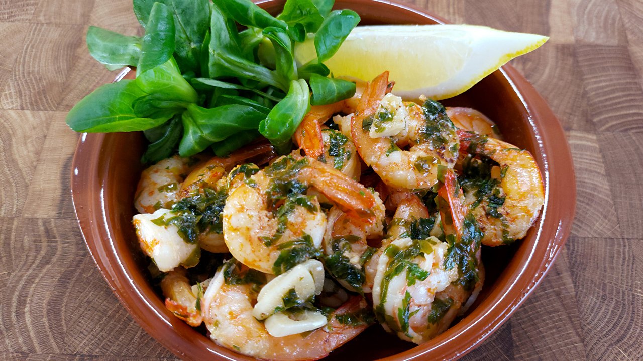 Жареные креветки в чесночном масле. Итальянская кухня.