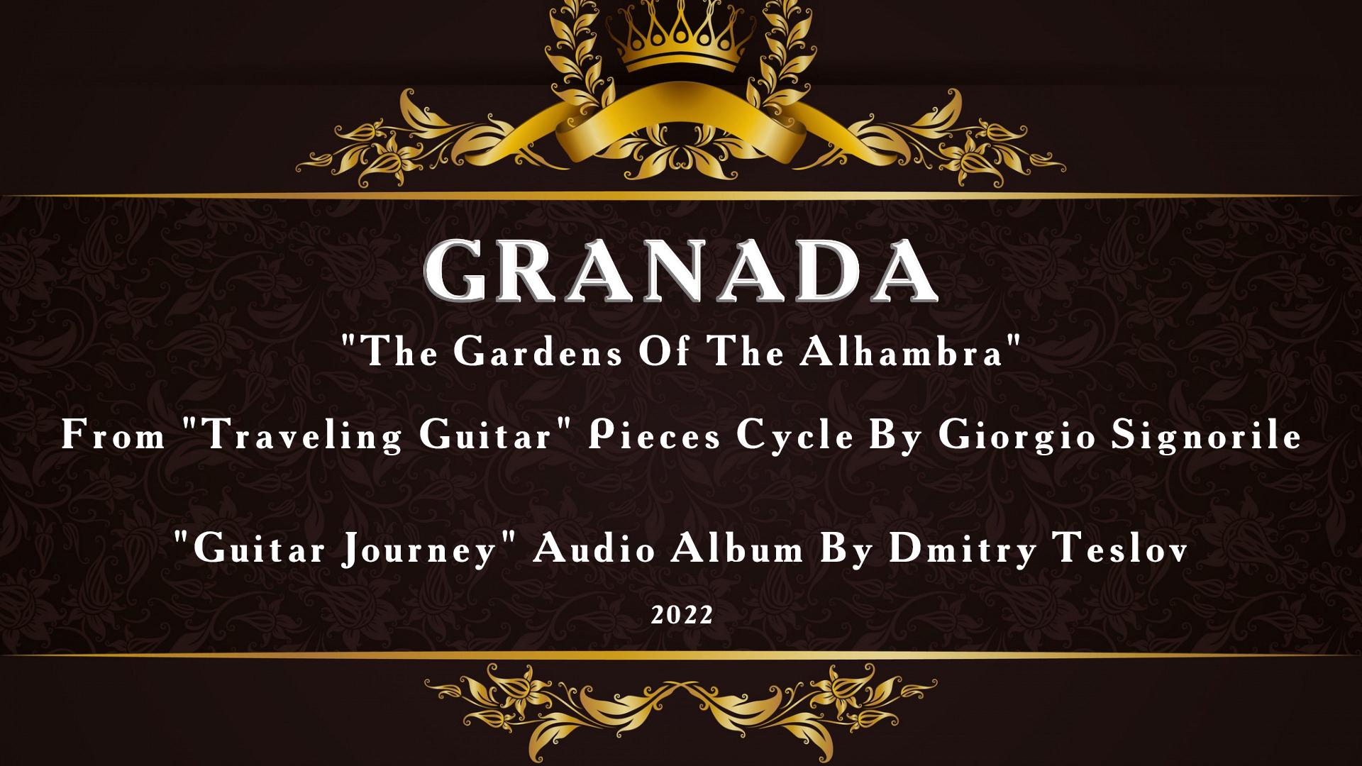 "Гранада" ("Сады Альгамбры") из цикла пьес Джорджио Синьориль "Путешествующая гитара". Аудиоальбом Дмитрия ТЕСЛОВА "Путешествие Гитары" (2022 г.). Подробно, скачать: http://teslov-music.ru/teslov-audio_guitar_journey_2022.htm. Гранада — город и муниципалитет в Испании, столица провинции Гранада в составе автономного сообщества Андалусия. Муниципалитет находится в составе района Вега-де-Гранада. Альгамбра (исп. Alhambra, от араб. аль-хамра - «красная») - архитектурно-парковый ансамбль, расположенный на холмистой террасе в восточной части города Гранада в Южной Испании. Основное развитие получил во времена правления мусульманской династии Насридов (1230—1492), при которых Гранада стала столицей Гранадского эмирата на Иберийском полуострове, а Альгамбра — их резиденцией (сохранившиеся дворцы относятся преимущественно к XIV веку). В состав обширного комплекса, заключенного в крепостные стены с башнями, входили также мечети, жилые дома, бани, сады, склады, кладбище. В настоящее время является музеем исламской архитектуры.