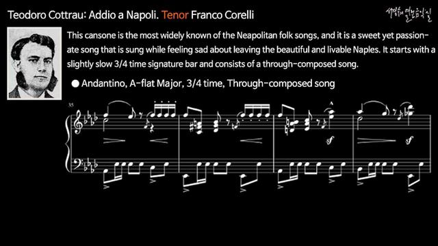 Teodoro Cottrau: Addio a Napoli. Tenor Franco Corelli 이 곡은 나폴리 민요 중에서 가장 널리 알려진 것으로 ‘산타 루차아’ 작곡자인 코트라우가 작곡하였다. 아름답고 살기 좋은 나폴리를 떠나게 됨을 애석하게 느끼며 부르는 감미로우면서도 열정적으로 표현한 곡이다. 조금 느린 3/4박자의 못 갖춘마디로 시작되며 통절 형식으로 구성되어 있다. ● 조금 느리게, 내림가장조, 3/4박자, 통절형식 Addio mia bella Napoli Addio, addio addio, addio, La tua soave immagine Chi mai chi mai scordar potrà! Del ciel l’azzurro fulgido, La placida marina, Qual core lo rinebria, Ardea ardea di voluttà. Il ciel, la terra e l’aura Favellano l’amore E sola al mio dolore Dal porto io sognerò, sì io sognerò. Addio mia bella Napoli, Addio, addio Addio care memorie Del tempo che passò. Tutt’altro ciel mi chiama, Addio, addio ma questo cor ti brama e il cor e il cor ti lascerò. Di baci e d’armonia è l’aura tua riviera, oh magica sirena fedel, fedele a te sarò. Al mio pensier più tenero Ritornano gli istanti Le gioie e le memorie Dei miei felici dì, I miei felici dì! Addio mia bella Napoli, Addio, addio addio care memorie Del tempo che passò. 아 그리운 내 고향 너 부디 잘 있거라 나폴리 내 사랑아 너 떠나가노라 그리운 나의 고향 언제나 다시 올까 잘 있거라 잘 있어 땅 위의 낙원이로다. 나폴리 내 사랑 땅 위의 낙원이로다. 나폴리 내 사랑 ■ '서경수의 열린 음악실'에서 상세 설명보기 https://cafe.naver.com/suhkuyung67/3839 ■서경수의 열린 음악실: 까칠한 수지가 즐겨 보는 음악감상 안내서https://www.yesolpress.com/goods_detail.php?goodsIdx=1641 ■음원출처: Leandro Campagni https://youtu.be/9qj75AHPu40