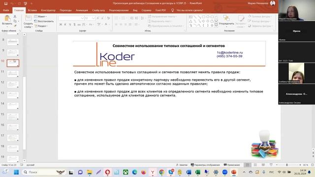 Компания «Кодерлайн» провела вебинар «Соглашения и Договоры в 1С:ERP 2.5» Ведущая: Ненашева Мария Андреевна - ведущий аналитик, функциональный архитектор 1С:Документооборот Целевая аудитория Вебинар будет полезен сотрудникам, ответственным за направление продаж в организации, внедрение и сопровождение системы 1С:ERP, пользователям системы в части продаж Описание Система 1С:ERP покрывает сразу несколько основных направлений учета на предприятии, в том числе и направление продаж. Настройки правил продаж включаю возможность гибко устанавливать как регламентированные условия взаимоотношений с клиентами с помощью Договоров так и коммерческие с помощью индивидуальных и типовых Соглашений. Возможности системы позволяют осуществлять гибкие настройки, что позволит вести учет в соответствии с особенностями бизнес-процессов организации. В ходе вебинара мы рассмотрим какие существуют настройки системы и в каком случает есть необходимость использовать ту или иную функциональность, а также на практическом примере увидим каким образом устанавливаются данные настройки. Программа 1. Общий обзор возможностей 1С:ERP 2.5 2. Соглашения об условиях продаж 2.1. Типовые соглашения об условиях продаж 2.2. Индивидуальные соглашения с клиентами 2.3. Согласование соглашений об условиях продажи 3. Договоры с клиентами
