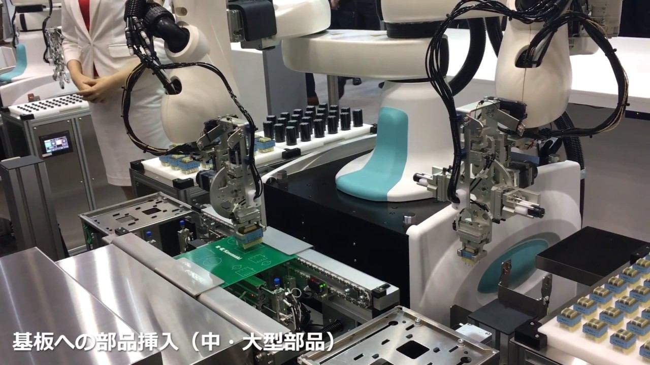 http://www.robowizard.ru/?utm_source=youtub Дистрибьютор Kawasaki Robotics в России и СНГ. В данном ролике коллаборативные роботы Kawasaki DuAro монтируют элетронные компоненты на печатные платы. В ролике можно увидеть работу вакуумных захватов, механических захватов для нескольких элементов схем (разъемы разного типа). Роботы размещают элементы различного размера в точно отведенное место на плате. Kawasaki (с)