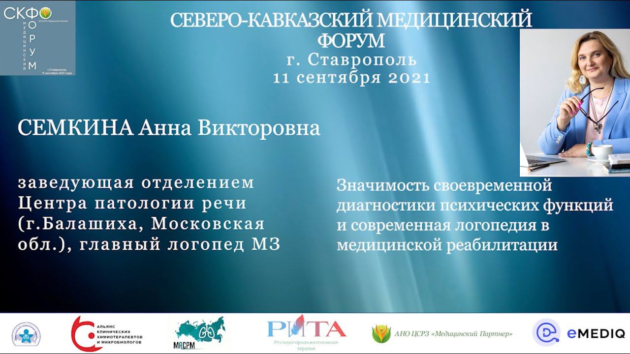 Симпозиум по нейрореабилитации 1. Семкина Анна Викторовна заведующая отделением Центра патологии речи (г.Балашиха, Московская обл.), главный логопед МЗ Московской области Тема лекции: "Значимость своевременной диагностики психических функций и современная логопедия в медицинской реабилитации" 2. Румянцева Мария Владимировна детский невролог, к.м.н, член «Национальной Ассоциации Детских Реабилитологов» Тема лекции: "Диспраксия и двигательные расстройства у детей" 3. Кулиш Ольга Олеговна клинический психолог, нейропсихолог, психотерапевт, преподаватель нейропсихологии на кафедре клинический и детской психотерапии Московского государственного психолого-педагогического университета (МГППУ) Тема лекции: "Индивидуальные процессы развития мозга и значение нейрореабилитации" Медицинский Форум СКФО, 11 сентября 2021г., г.Ставрополь
