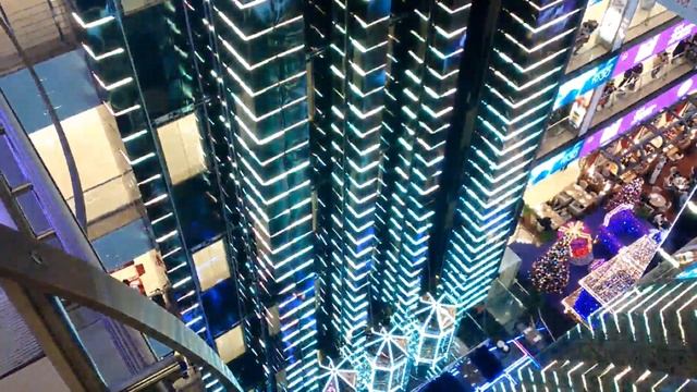 ТЦ Европейский. Лифтовая шахта напоминает Звездные войны, такие же светящиеся черные столбы вокруг лифтов