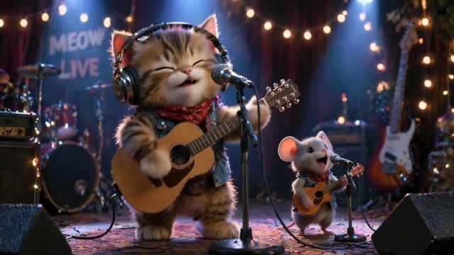 Энергичная мяу-песня для кошек и людей с атмосферой живого концерта. Кошка поёт в микрофон и играет на гитаре, а мышка поддерживает её на маленькой сцене со своей мини-гитарой. Подходит для бодрого настроения, улыбки и музыкального вайба.