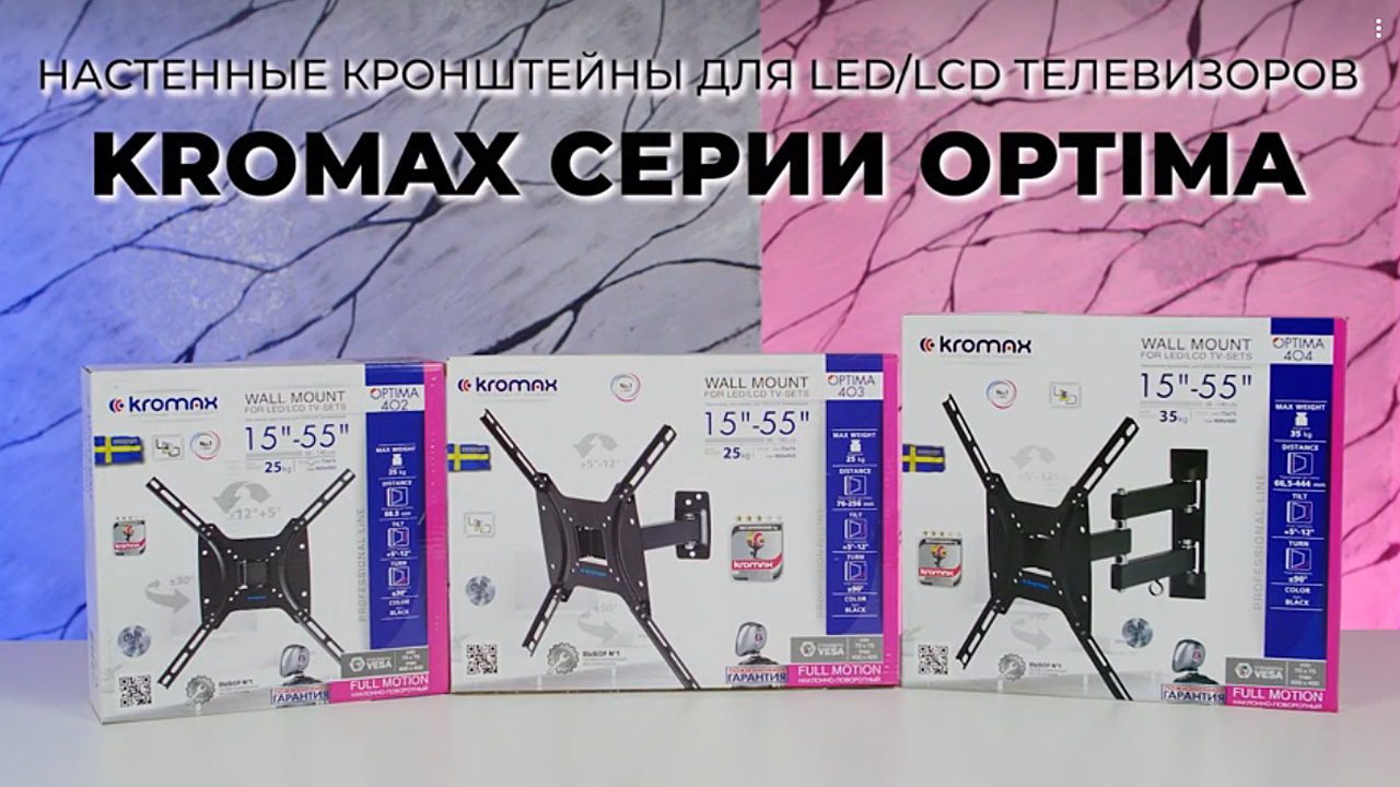 Кронштейны подходят для большинства телевизоров популярных брендов, таких как Samsung, LG, Sony, Panasonic, Sharp, Toshiba, KIVI, Xiaomi Mi, SUPRA, Hyundai, Erisson, Horizont, JVC, Thomson, HAIER, BBK, Витязь, Веко, BQ, OZON, SkyLine, Pioneer, Philips, Rolsen, Harper, Hisense, Hitachi, Polarline, Prestigio и других. Крепёжные отверстия изготовлены по стандарту VESA. В комплектацию кронштейнов входят необходимые для монтажа материалы. Вся продукция обеспечивается гарантийными обязательствами. Пожизненная гарантия на все сварные и механические соединения позволит наслаждаться конструкцией долгий срок. Во время эксплуатации кронштейны OPTIMA демонстрируют поразительную износостойкость и безотказность. KROMAX OPTIMA-402 https://www.kromax.ru/produce/pan_tilt/4324/ KROMAX OPTIMA-403 https://www.kromax.ru/produce/pan_tilt/4325/ KROMAX OPTIMA-404 https://www.kromax.ru/produce/pan_tilt/4326/