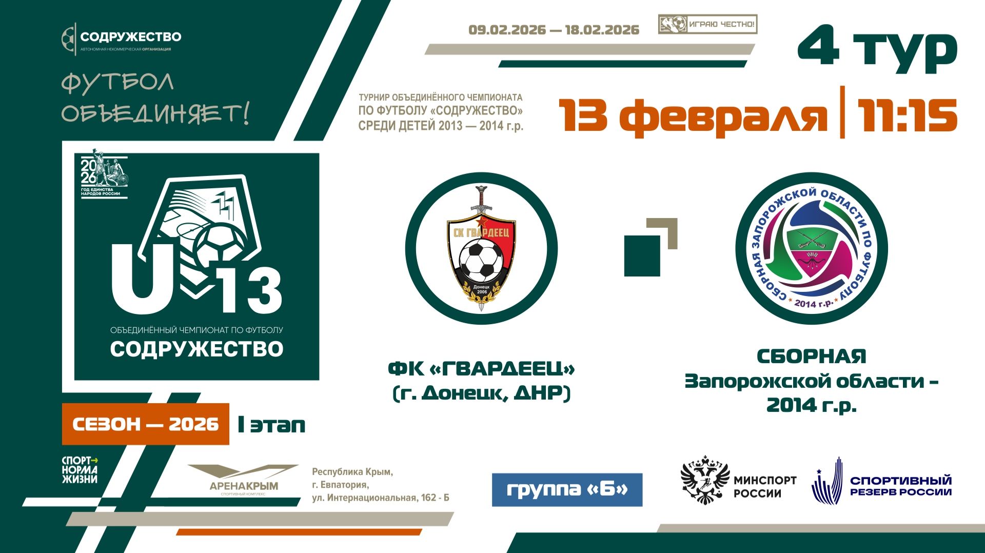 4 ТУР [Группа Б] | ФК «Гвардеец» (г. Донецк, ДНР) - Сборная Запорожской области 2014 г.р. | 13.02.2026 | 11:15