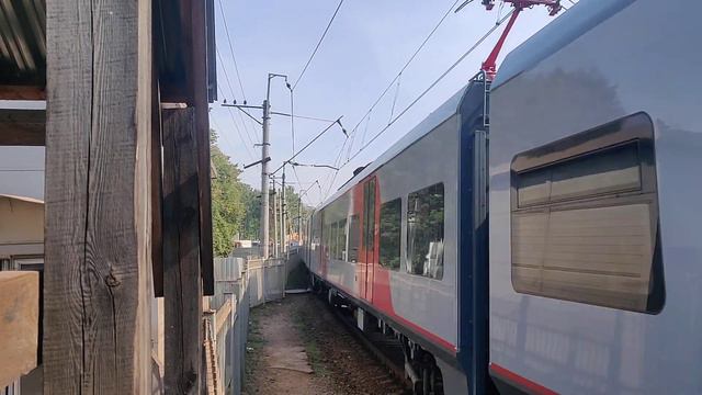 Поезд ЭС2Г 103 Ласточка пролетает платформу Переделкино