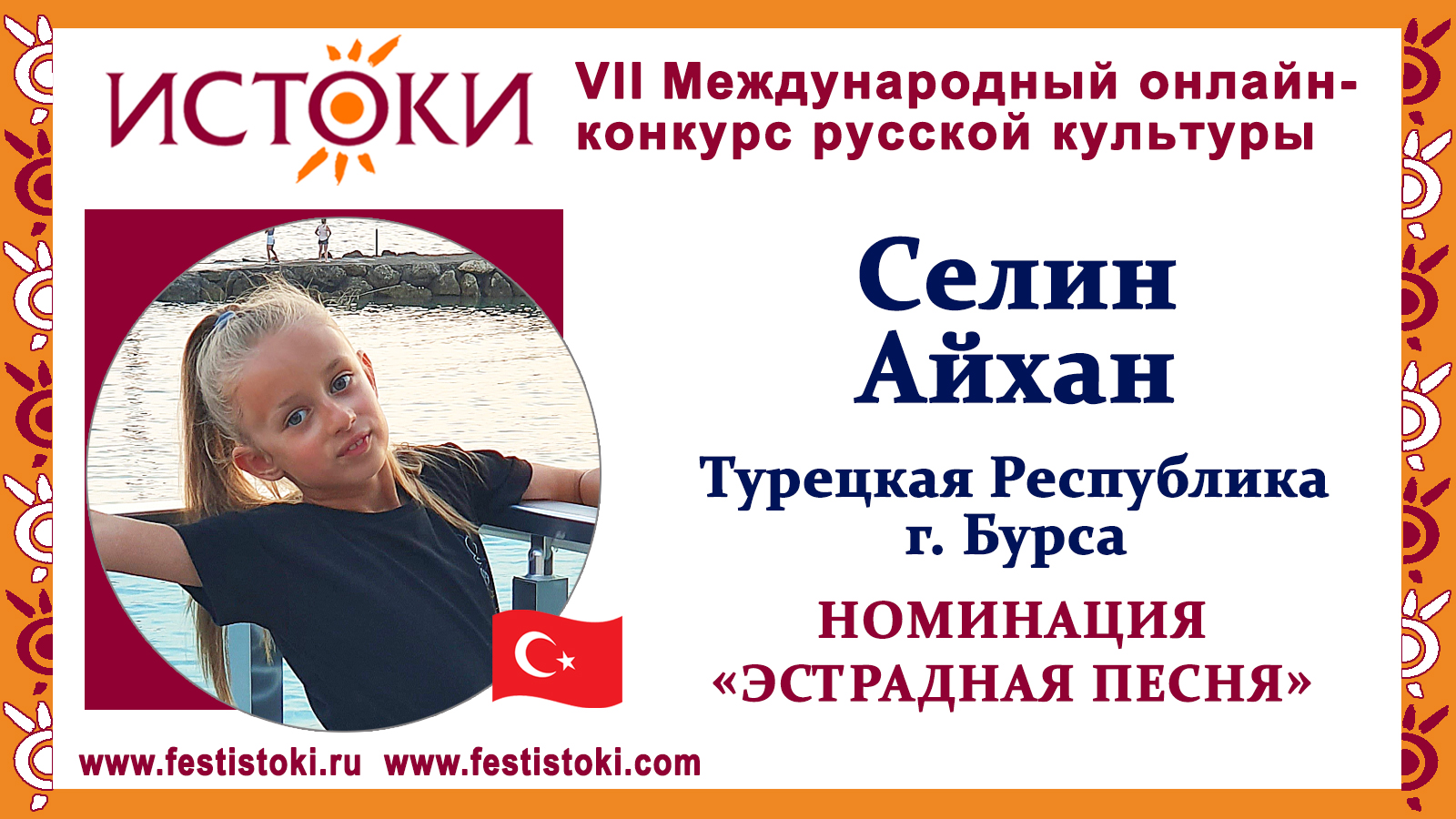 Участник VII Международного онлайн-конкурса русской культуры "Истоки". Номинация "Эстрадная песня". Песня "Волшебный цветок" из м/ф "Шелковая кисточка". Слова М.Пляцковского; Композитор Ю.Чичков. Сайт: www.festistoki.ru / www.festistoki.com E-mail: festistoki@mail.ru