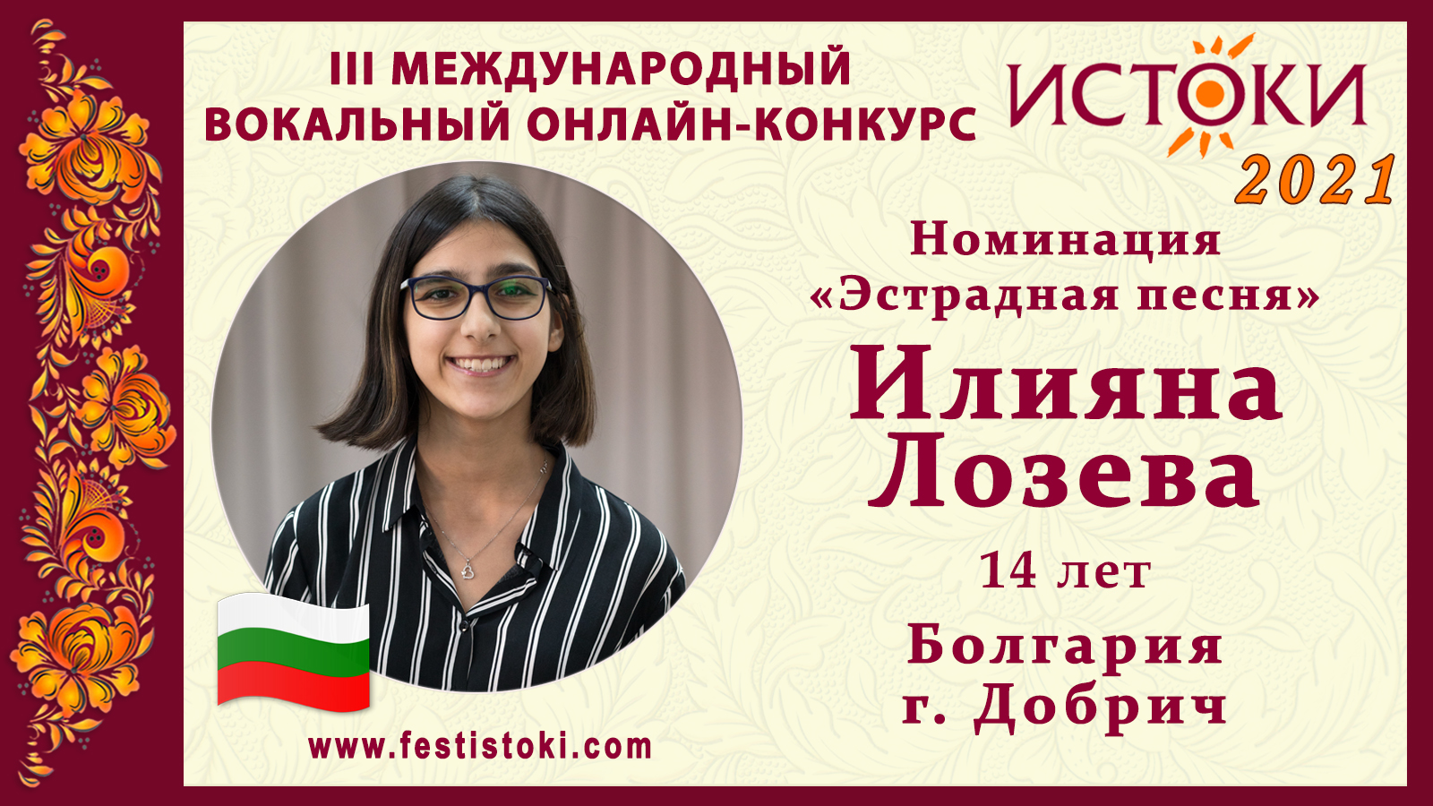 Лауреат III степени III Международного вокального онлайн-конкурса «Истоки». Номинация "Эстрадная песня". Песня "I Wanna Dance With Somebody" Авторы George Merrill; Shannon Rubicam Сайт: www.festistoki.ru / www.festistoki.com E-mail: festistoki@mail.ru