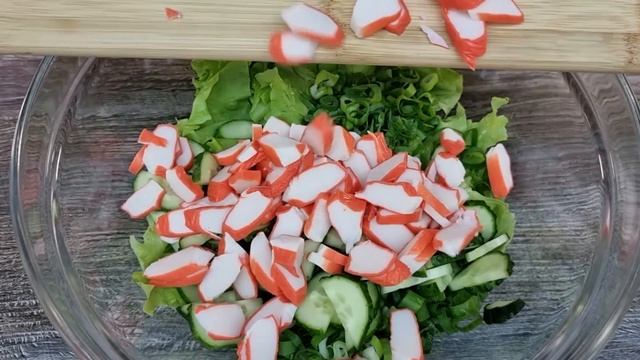 Здравствуйте, уважаемые подписчики и гости моего канала! Вкусный салат! Крабовые палочки и яйца придают салату сытность, а овощи вносят свежесть и легкость. Готовьте на здоровье! Ингредиенты: листья салата небольшой пучок; перья зеленого лука небольшой пучок; 1 огурец; 6-8 крабовых палочек; 4 вареных яйца; 3-4 столовых ложки майонеза (сметаны или белого йогурта); Приятного аппетита! Спасибо что, смотрите👀 наши ролики! Если Вам не сложно, подпишитесь🔊 на наш канал, нам будет приятно! Если Вам понравился рецепт, поставьте 💘,сделайте репост;) Для развития канала,поддержите нас пожалуйста🙏 небольшой суммой в руб.💲. Вам мелочь, а нам приятно.🌹
