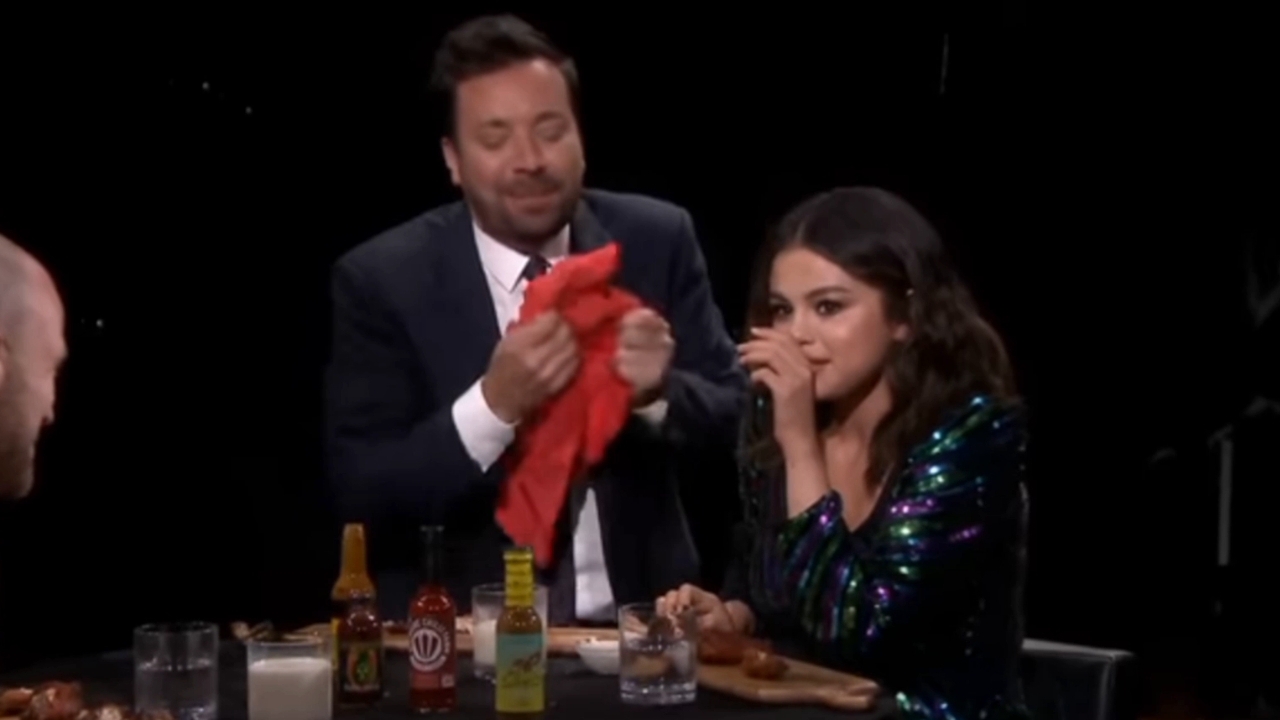 Селена Гомес и Джимми плачут, поедая острые крылышки (горячие)