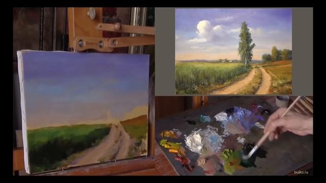 Простой пейзаж с сельской дорогой. Живопись маслом. Etude oil painting