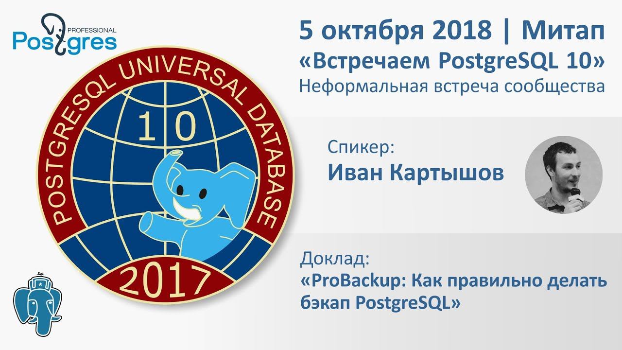 Митап «Встречаем PostgreSQL 10» Иван Картышов «ProBackup: Как правильно делать бэкап PostgreSQL» 5 октября 2017 20171005