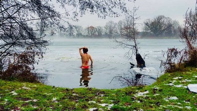 Купальщица в холодной воде озера.