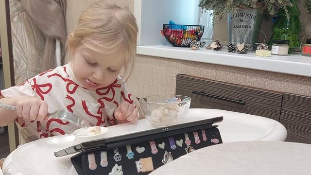Внучка ест пельмени, только после еды можно сладкое!