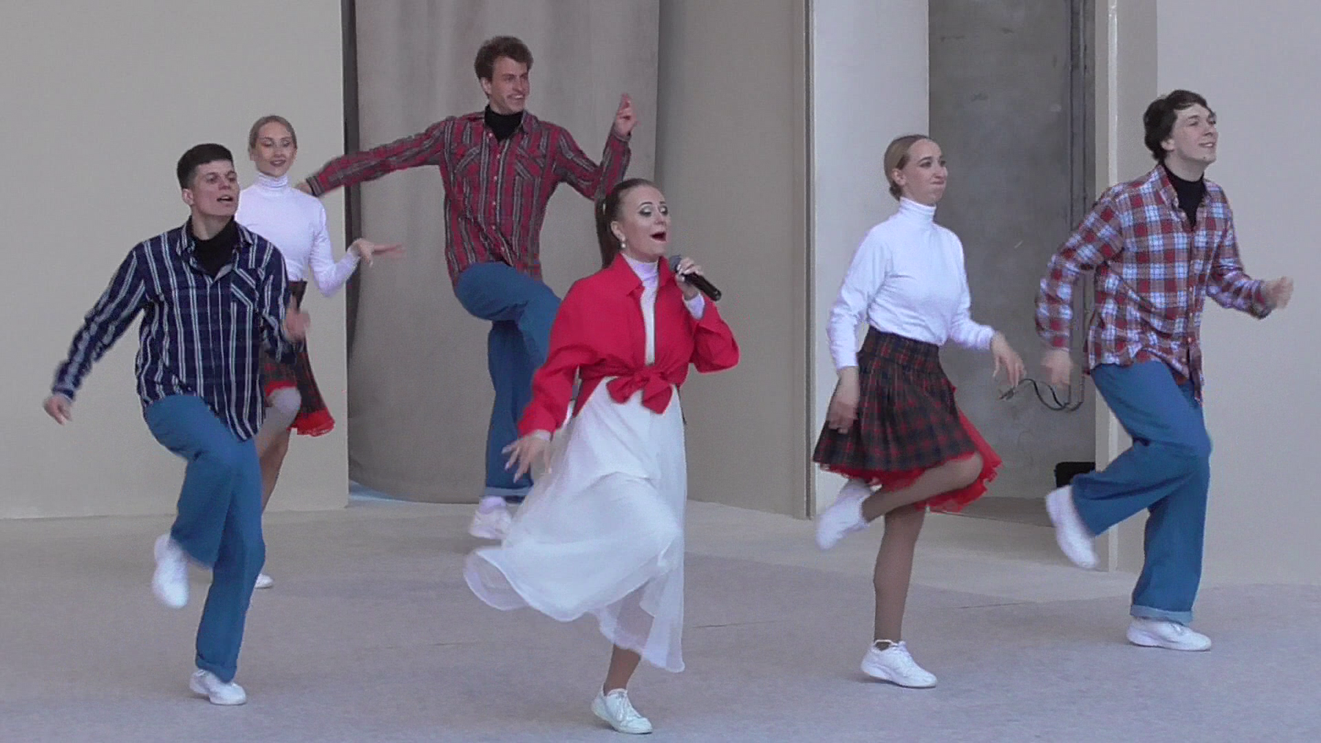 Танцевальный коллектив танцует танец. Певица поёт песню: Наш сосед