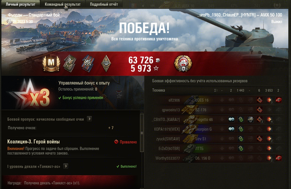 ФЬОРДЫ МАСТЕР на AMX 50 100 ОПЫТ: 1327 СУММАРНЫЙ УРОН: 5096 медаль ТАНКИСТ СНАЙПЕР
