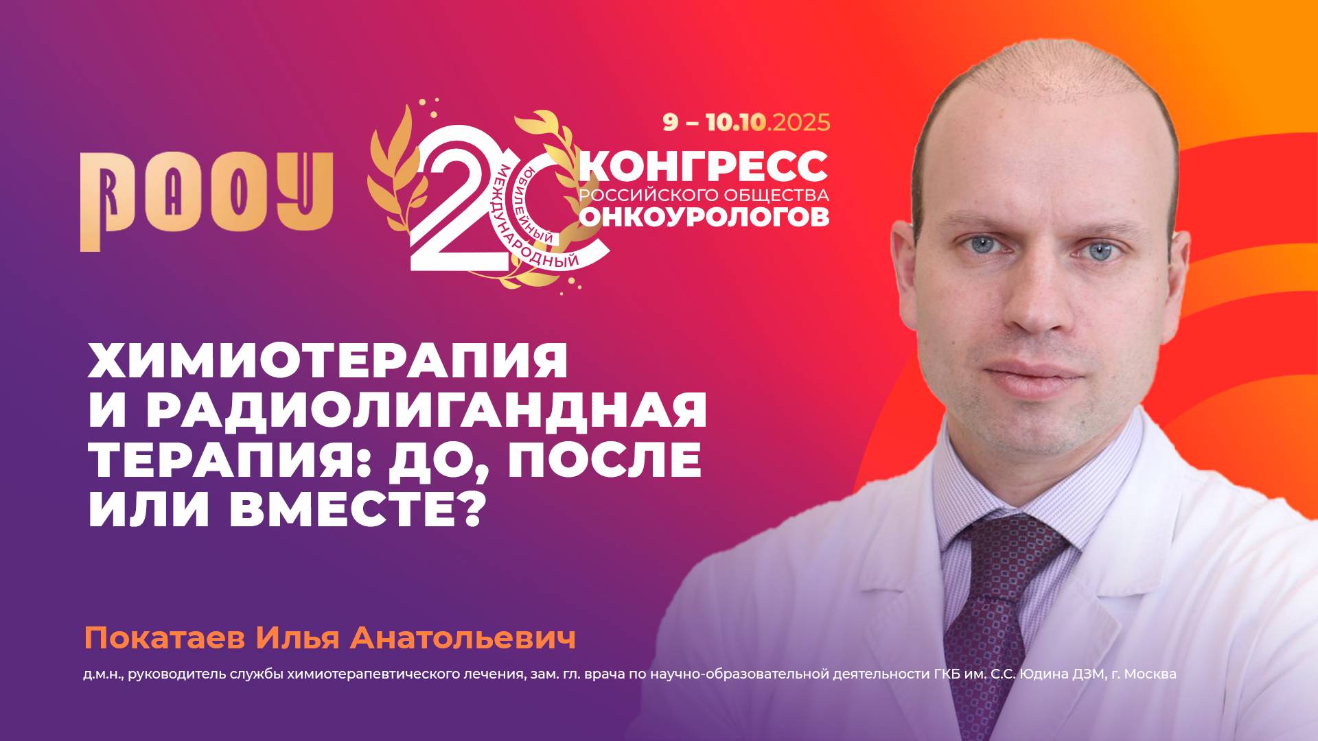9 октября на XX Международном Конгрессе РООУ Покатаев Илья Анатольевич представил доклад на тему: "Новые гормональные препараты и радиолигандная терапия: последовательно или в комбинации?" ✅ Эксперт: Покатаев Илья Анатольевич, д.м.н., руководитель службы химиотерапевтического лечения, зам. гл. врача по научно-образовательной деятельности ГКБ им. С.С. Юдина ДЗМ, г. Москва. ➡️ Официальный сайт РООУ: https://roou.ru/ Присоединяйтесь к нам в социальных сетях. Делитесь мнением и повышайте уровень теоретической и практической подготовки в онкоурологии: Telegram: https://t.me/oncologyurology ВКонтакте: https://vk.com/oncologyurology #РООУ #RAOU #ОбществоОнкоурологов #Онкоурология #Урология #Онкология #Oncourology #XVКонгрессРООУ #КонгрессРООУ #ракпочки #медицинскиеконференции #urology