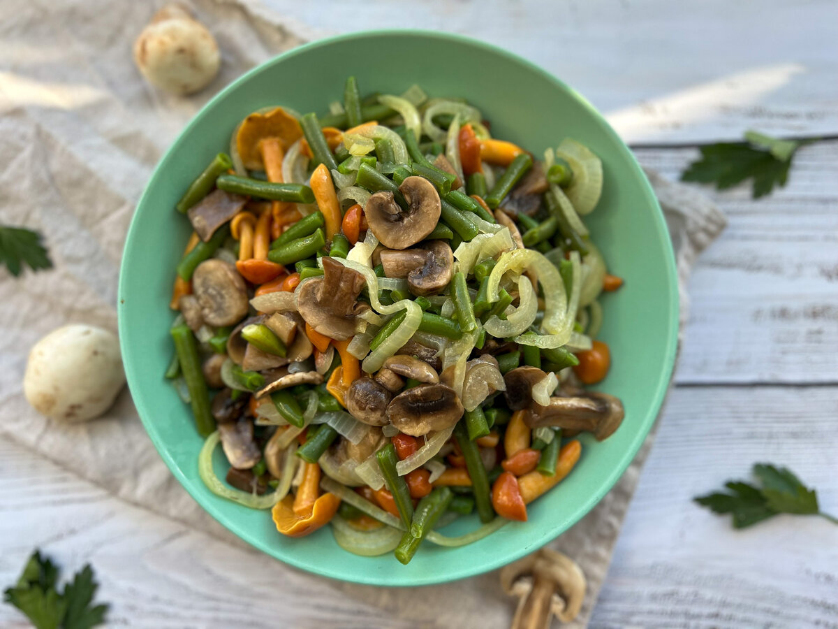 Такой овощной салатик можно есть и в пост! Очень вкусный, сытный и питательный. Даже мужчинам-мясоедам нравится! Что нужно: шампиньоны маринованные опята лук репчатый стручковая фасоль оливковое масло (для заправки) соевый соус (для заправки)
