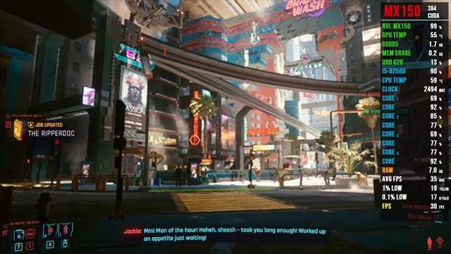 Latest patch V1.22 *Settings* 720p Lowest please like the video for supporting me making new videos! ?MY SPECS? ◽️ Intel Core i5 8250U 1.6GHz Base, 3.4GHz Turbo ◾️ Nvidia GeForce MX 150 2GB (Driver 461.72) ◽️ 2 x 4 GB DDR4 RAM Dual Channel Mode 2400 Mhz PC19200 ◾️ 256GB SSD ◽️ 1TB HDD WDC 5400RPM ◾️ Windows 10 pro x64 20H2 build 985 ◽️ Record with Windows Game DVR ◾️ Screen Overlay: FPS Monitor #cyberpunk2077 #mx150