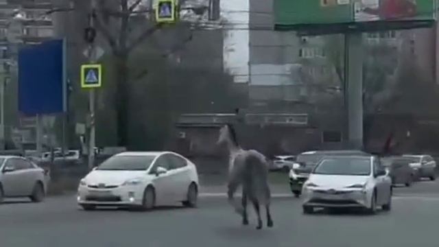 Перепуганная лошадь посреди проезжей части запрыгнула на лобовое стекло, шокировав водителей