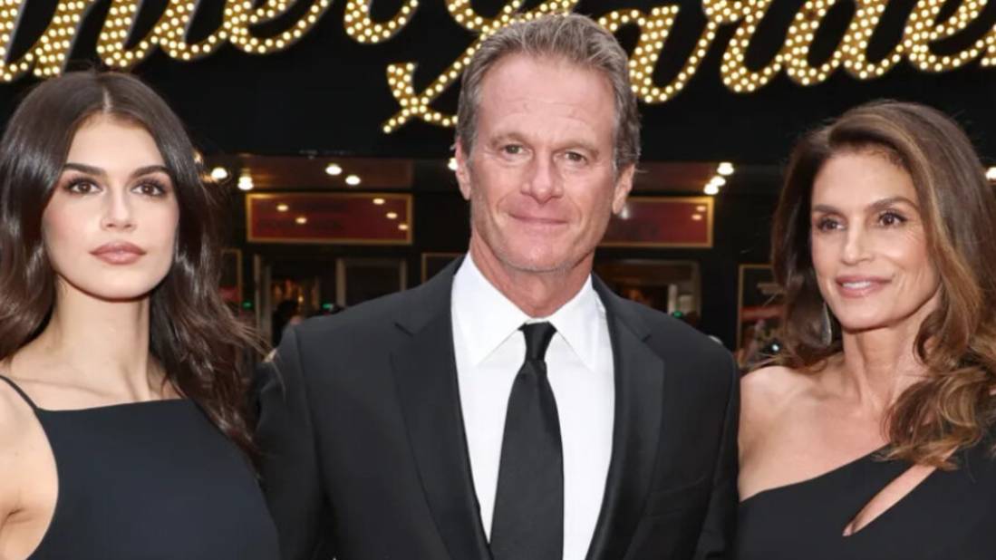 Синди Кроуфорд в платье с открытым плечом и высоким разрезом появилась на премьере с мужем и дочерью