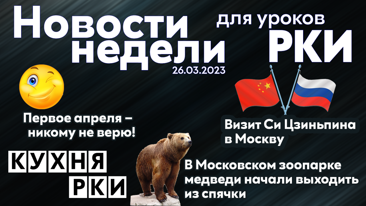 А вы знаете, что медведи уже выходят из спячки? И какие самые популярные шутки 1 апреля? И о чем договорились Россия и Китай на этой неделе? Обо всем об этом вы узнаете в нашем новом выпуске адаптированных новостей для иностранцев, изучающих русский язык. В упражнениях к каждой новости вы найдете коммуникативные упражнения, задания для работы с текстом и много интересной страноведческой информации и лексики! Актуальные события недели: ? Визит Си Цзиньпина в Москву (В1) ? Московском зоопарке медведи начали выходить из спячки (А2-B1) ? Первое апреля – никому не верю! (А2) ???Скачать рабочий лист к этому выпуску новостей можно по ссылке: https://disk.yandex.ru/i/PhRyHSPKZYyrJQ ??? Успехов вам на занятиях! 00:00 Визит Си Цзиньпина в Москву 02:03 Комментарий Марии Захаровой 03:12 Московском зоопарке медведи начали выходить из спячки 03:47 Первое апреля – никому не верю! Инструкция по применению наших рабочих листов: https://rutube.ru/video/5bcd06e0f3dbfbdf27a325a4d47bef73/ Присоединяйтесь к нам в Телеграм, чтобы получать наши материалы первыми! https://t.me/kuhnarki