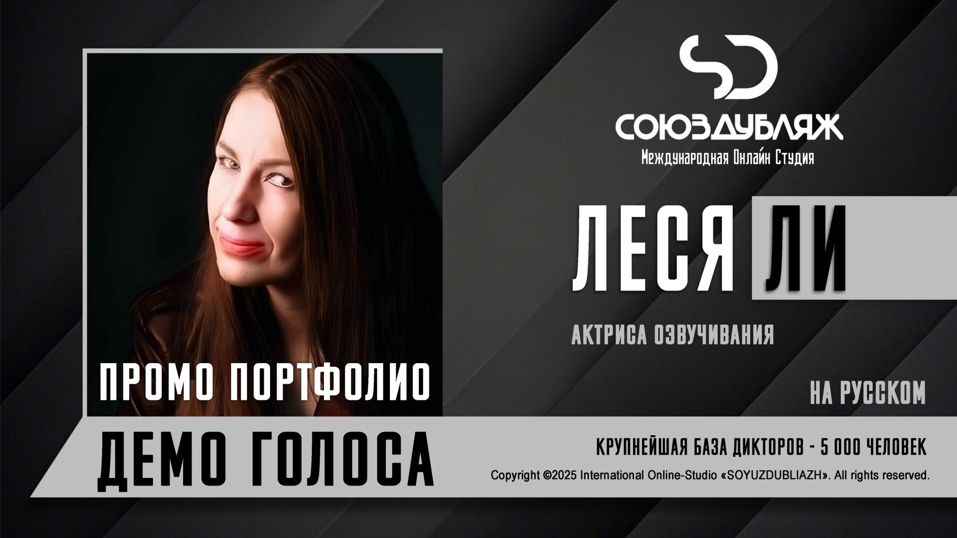 #СоюзДубляж #БазаДикторов #Озвучка ✔️Леся Ли, диктор-актриса озвучивания. Международная Онлайн-Студия "СОЮЗДУБЛЯЖ" - профессиональная озвучка и дубляж. ▪️Рабочая группа в Телеграм: https://t.me/soyuzdubliazh ▪️Контакт для связи: https://t.me/SoyuzAdmin ▪️Подпишись:https://www.youtube.com/c/SOYUZDUBLIAZH ▪️Сайт: https://www.soyuzdubliazh.com/ Лучшие голоса для вашей аудиорекламы и видеороликов. База дикторов - 5 000 человек, профессионального уровня на ENG| FR| TR| RU| ISR| AZ| UA| KZ| UZ| языках. Мужские и Женские топовые голоса для озвучки любых проектов, таких как: Рекламы, Презентации, Фильмы, Сериалы, Игры, Мультфильмы, ТВ Шоу, Аудио-видео визитки. ✔️Сотрудничая с нами вы получаете свой проект под ключ, не выходя из дома или офиса. Наша слаженная команда из лучших дикторов, актёров озвучивания, режиссёров и звукорежиссёров в кратчайшие сроки озвучат или отдублируют ваш заказ на профессиональном уровне. Образцы работ нашего портфолио вы сможете посмотреть на канале СОЮЗДУБЛЯЖ. ВНИМАНИЕ: ✔️Мы приглашаем специалистов озвучки к сотрудничеству в нашей команде. Вы можете пройти по ссылке в наш телеграм канал и связаться с Админом для обсуждения. ✔️Всем заказчикам подобных медиа проектов по озвучки и дубляжу фильмов, сериалов, документалок обращаться непосредственно к Админу Телеграм группы СОЮЗДУБЛЯЖ, пройдя по ссылке: Проходи по ссылке: https://t.me/soyuzdubliazh International Online-Studio SOYUZDUDLIAZH presents a highly professional approach in voice-over and dubbing. ▪️Our working group https://t.me/soyuzdubliazh ▪️Chief manager https://t.me/SoyuzAdmin ▪️Follow https://www.youtube.com/c/SOYUZDUDLIAZH ▪️Web: https://www.soyuzdubliazh.com/ We offer You the best Voices for your Audio commercials and Video`s. Our Database contains over 5 000 voices of native speakers and high-class foreign language specialists in ENG| FR| TR| RU| ISR| AZ| UA| KZ| UZ|. Male & Female top level voices for all the variety of dubbing projects such as commercials, presentations, movies, TV-series, video and computer games, cartoons, TV-shows, audio & video portfolio’s – all in one place. As your business partner we guarantee a turn-key project without you leaving your house or office. Our target is to make sure that the dubbing of your project is made as quick as possible by a well-coordinated and professional team of the best speakers, film and sound directors. To whom it may concern! We invite dubbing specialists to join our team. Please contact our manager on Telegram https://t.me/soyuzdubliazh