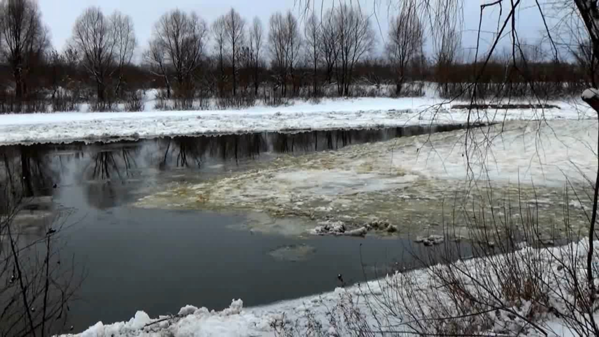 Образование затора из шуги перед мостом через Клязьму около города Вязники.