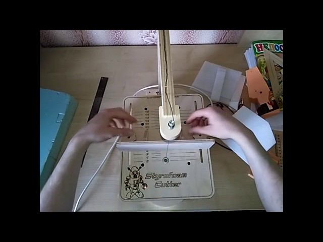 Эта пенорезка состоит из фанеры 9мм, изготовлена на станке с ЧПУ. Электроника Ac-Dc (220в-12в). Дополнительно пришлось проложить проволоку для снижения напряжения до 8в, т.к. оказалось, что на 12 слишком сильно греется нить. Используется нихромовая нить (продается в любом хоз.магазине)