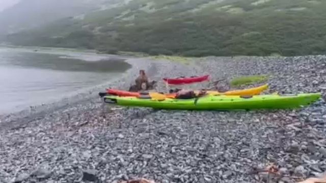Медвежье семейство на Камчатке заглянуло в гости к туристам. Пока люди снимали банду издалека, медведица разрешила медвежатам обшарить лодки в поисках припасов.
