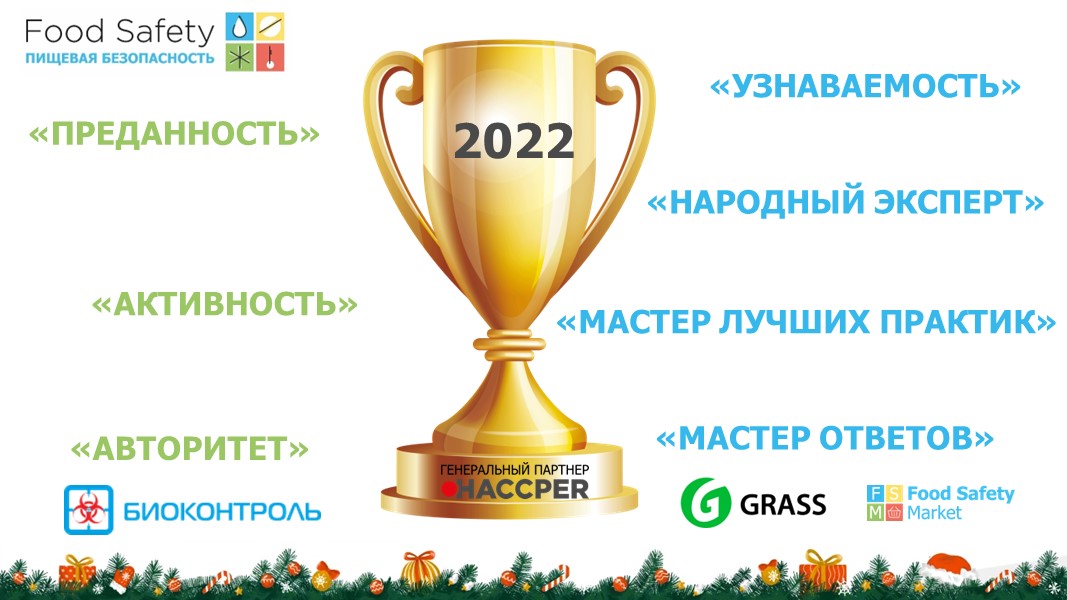 На вебинаре мы наградили самых активных и преданных участников сообщества по итогам 2022 года и экспертов, которые могут с гордостью носить звание "Лучший спикер Food Safety 2022". Призы лучшим спикерам и самым активным членам сообщества на итоговом вебинаре 2022 года предоставлены партнерами Food Safety – компаниями, предлагающими передовые профессиональные решения для пищевых предприятий, а также специализированным мультибрендовым маркеплейсом: HACCPER - https://haccper.ru/ GRASS - https://grass.su/ БИОКОНТРОЛЬ - https://biocontrolgr.ru/ Food Safety Market - https://foodsafetymarket.ru/ В номинации «ПРЕДАННОСТЬ» (посетил наибольшее количество вебинаров) победителями стали: • Ирина Казакова; • Оксана Коковкина; • Валерий Мацына. В номинации «АКТИВНОСТЬ» (задал больше всего вопросов на всех вебинарах) победителями стали: • Елена Полонникова; • Наталья Будкина; • Наталья Старикова. Лучшие спикеры Food Safety 2022 • Дмитрий Соколов победил в номинации «УЗНАВАЕМОСТЬ» (наибольшее количество выступлений на вебинарах Food Safety в 2022 году); • Алексей Федоров победил в номинации «НАРОДНЫЙ ЭКСПЕРТ» (по итогам открытого голосования участниками сообщества Food Safety); • Вера Шишиморова победила в номинациях «МАСТЕР ЛУЧШИХ ПРАКТИК» (как автор наибольшего количества Лучших практик за 2022 год) и «МАСТЕР ОТВЕТОВ» (за наибольшее количество ответов на вопросы участников сообщества Food Safety за 2022 год). В номинации «АВТОРИТЕТ» по итогам 2022 года победителем стала компания Агрохолдинг «Комос Групп» как организация, самое большое количество сотрудников которой посетило наши вебинары. Поздравляем от всей души и напоминаем, что в следующем году на их месте может оказаться кто-то из вас!