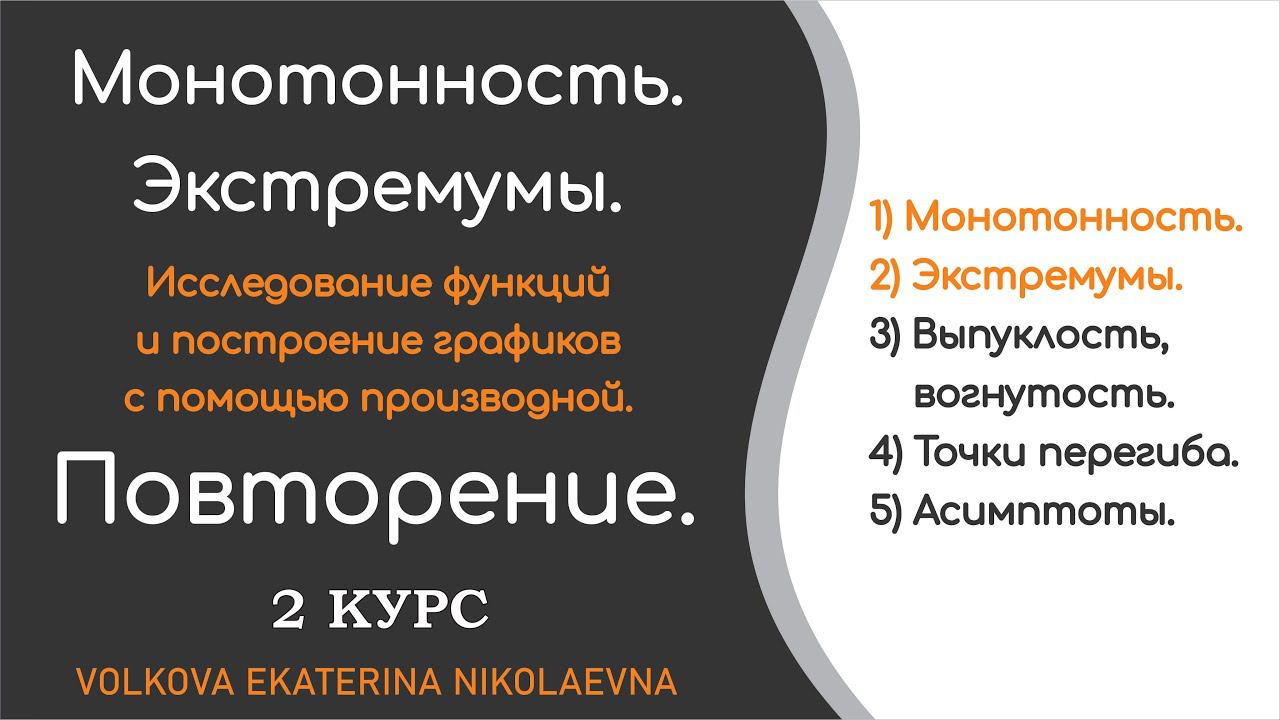 Исследование функций и построение графиков с помощью производной. Монотонность. Экстремумы. Уроки с 1 курса: Промежутки монотонности функции. Урок 8.1. https://www.youtube.com/watch?v=jhKDxT1fwkQ&t=351s Экстремумы функции. Урок 8.2. https://www.youtube.com/watch?v=Md8wDhq_dZk&t=286s Выпуклость графика функции. Точки перегиба. Урок 8.3. https://www.youtube.com/watch?v=9InK3qPQknI&t=5s Общая схема исследования функции для построения её графика. Урок 8.4. https://www.youtube.com/watch?v=DTmTIY4K5-Q&t=7s Пример построения графика функции. Урок 8.5. https://www.youtube.com/watch?v=YPMTZlwhQk4&t=217s Наибольшее и наименьшее значения функции. Урок 9. https://www.youtube.com/watch?v=5zAEsLFdlUU&t=37s Нахождение наибольшего и наименьшего значений функции, непрерывной на отрезке. Практика. Урок 9.1. https://www.youtube.com/watch?v=lpBFzMziCeA Тайминг: 00:00 Введение. 03:38 Монотонность. 07:44 Экстремумы. 16:06 Пример 1. Найти интервалы монотонности (возрастания и убывания) функции и точки экстремума. 22:28 Пример 2. Найти наименьшее и наибольшее значение функции на отрезке. Поддержать автора: https://yoomoney.ru/to/4100118156988006 Ссылка на мой Яндекс Дзен "Волкова Е.Н. Понятная математика. Техникум и колледж." - https://dzen.ru/video/watch/646f00f02ece6b5eb619f61f