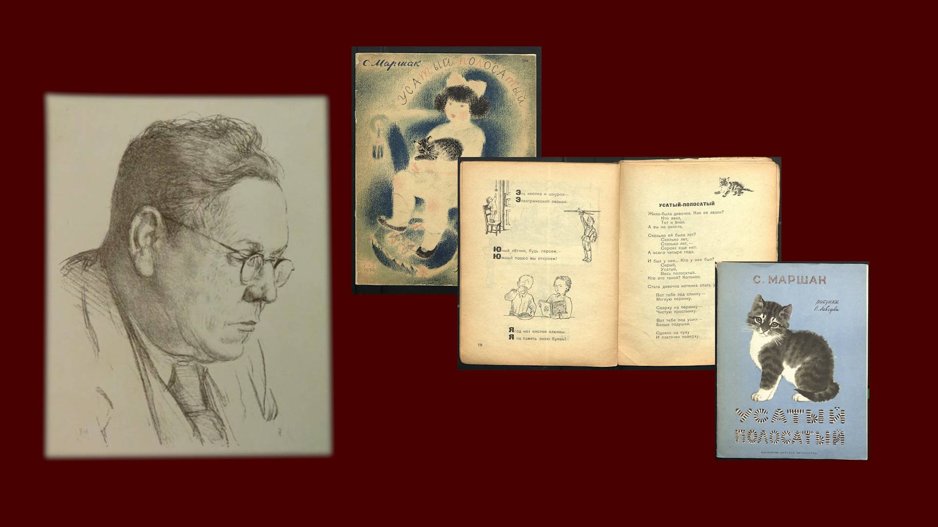 Многие из нас росли на произведениях Самуила Яковлевича Маршака. В том числе и сын писателя Яков. Именно благодаря малышу мир увидело одно из самых популярных произведений автора — «Усатый полосатый». Практически всю свою жизнь Маршак вносил правки и редактировал любимую детскую историю. В преддверии международного Дня защиты детей в «Предметном разговоре» рассмотрим три издания «Усатого полосатого», посмотрим, какие изменения претерпел текст и рисунки, которые вне зависимости от версии так полюбились читателям. В этом нам поможет Светлана Макаренкова, старший научный сотрудник отдела книжного фонда Исторического музея.