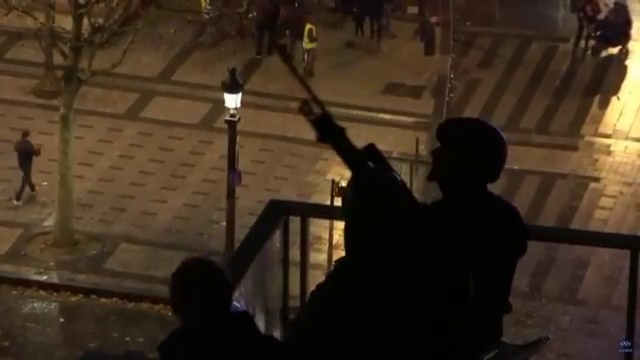 Un tireur (sniper) positionné sur le toit d'un immeuble sur les Champs-Elysées dans le cadre de la manifestation des Gilets jaunes.