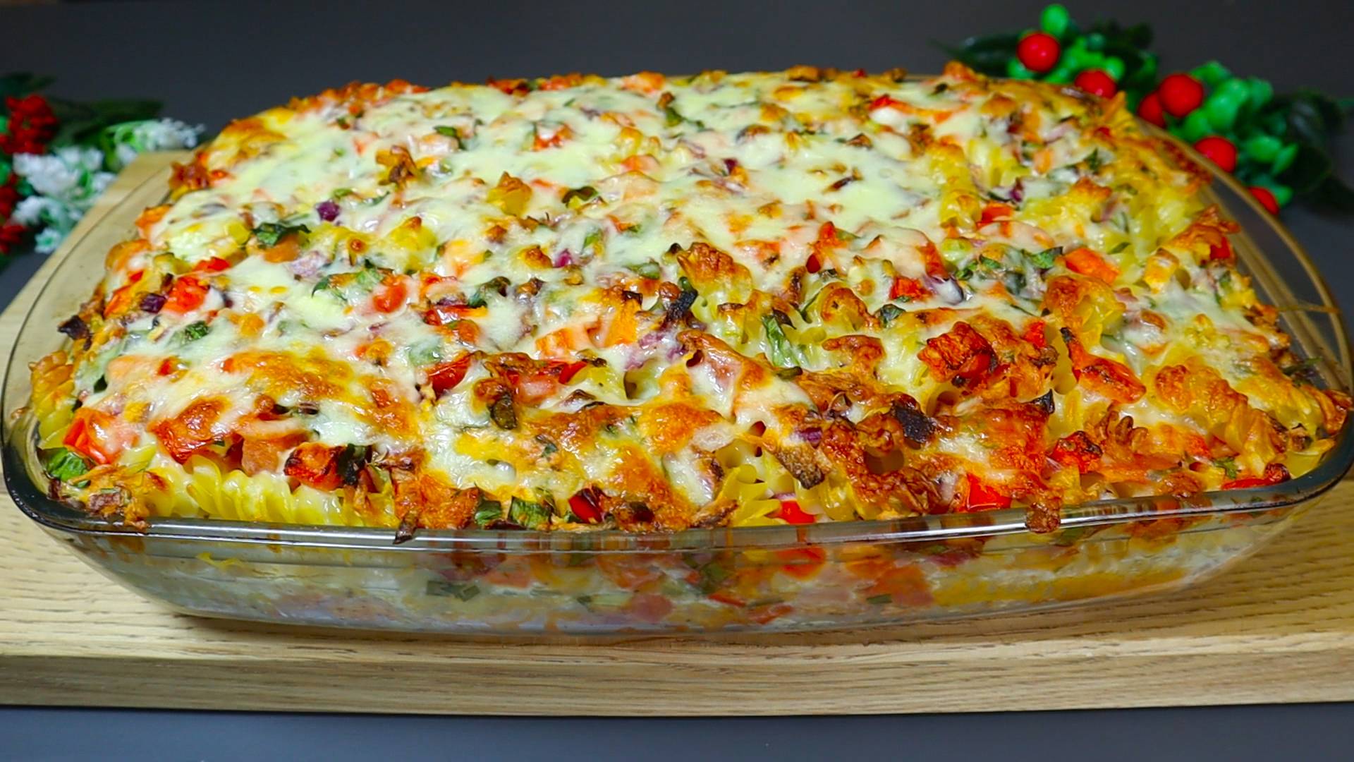 Добрый день! Сегодня мы приготовим простой и вкусный ужин с макаронами. Рецепт запеканки на ужин с курицей и макаронами. - куриное филе 2 шт. - паприка + сухой чеснок. - Прованские травы. - черный молотый перец. - соевый соус 40 мл. - мариновать 25-30 минут. - макароны 300-350 г. - посолить и тушить до готовности. - яйца 5 шт. - соль + черный молотый перец. - помидор. - сладкий красный перец. - луковица. - чеснок 2 зубчика. - зеленый лук. - Петрушка. - твердый сыр 100 г. - растительное масло. - отправляем в духовку на 25 минут при температуре 180 °C. - 100 г моцареллы. - отправляем в духовку на 10 минут при температуре 180°C. Наш ужин готов! Если вам понравилось, поставьте лайк, подпишитесь и напишите комментарий!