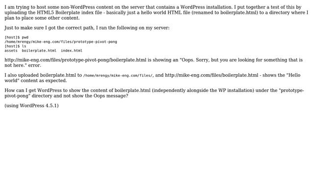 Wordpress: "Oops." error on an html file directly uploaded to a subdirectory of my WordPress site Helpful? Please support me on Patreon: https://www.patreon.com/roelvandepaar With thanks & praise to God, and with thanks to the many people who have made this project possible! | Content (except music & images) licensed under CC BY-SA https://meta.stackexchange.com/help/licensing | Music: https://www.bensound.com/licensing | Images: https://stocksnap.io/license & others | With thanks to user Mike Eng (wordpress.stackexchange.com/users/7313), user cybmeta (wordpress.stackexchange.com/users/37428), and the Stack Exchange Network (wordpress.stackexchange.com/questions/236857). Trademarks are property of their respective owners. Disclaimer: All information is provided "AS IS" without warranty of any kind. You are responsible for your own actions. Please contact me if anything is amiss at Roel D.OT VandePaar A.T gmail.com
