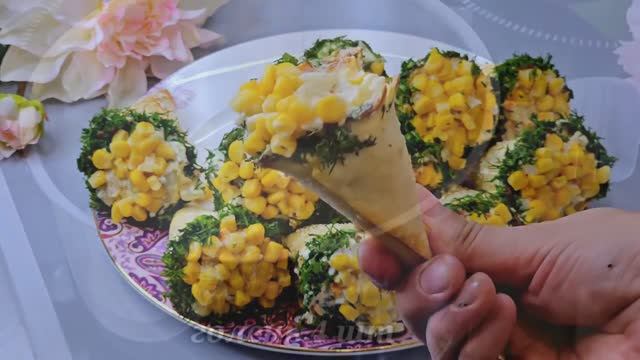 Рецепт № 1 лаваш; отварной картофель - 1 шт.; отварной морковь - 1 шт.; отварные яйца - 3 шт.; соленые огурцы - 2 шт.; майонез - 2-3 шт.; укроп и кукуруза. Рецепт № 2 голень - 4 шт.; морковь - 1 шт.; лук - 1 шт.; лавровый лист, соль и специи - по вкусу; зеленый горошек; яйца; маслина и зелень. Рецепт № 3 мясной рулет из фарша; сметана - 200 г; яйца - 5 шт.; манная крупа - 2 ст. л.; сыр - 200 г; фарш - 400 г; чеснок - 2 зубчика; лук - 2 шт.; грибы - 350 г; соль, перец, паприка и т. п. - по вкусу. Рецепт № 4 фарш - 500 г (смешанный): говяжий - 300 г; куриный - 200 г; лук - 2 шт.; морковь - 1 шт.; чеснок - 3-4 зубчика; яйца - 4 шт.; соль и специи - по вкусу. Рецепт № 5 свекла - 1 шт.; соль - 1 ч. л.; уксус - 1 ст. л.; яйцо - 1 шт.; вода - 200 мл; мука - 420 г. Для начинки: мясо - 400 г; лук - 4 шт.; соль и специи - по вкусу; подсолнечное или сливочное масло - 100 мл. Рецепт № 6 картофель - 2 шт.; отварная свекла - 2 шт.; отварные яйца - 2 шт.; саленые огурцы - 2 шт.; укроп; майонез - 2-3 ст. л.